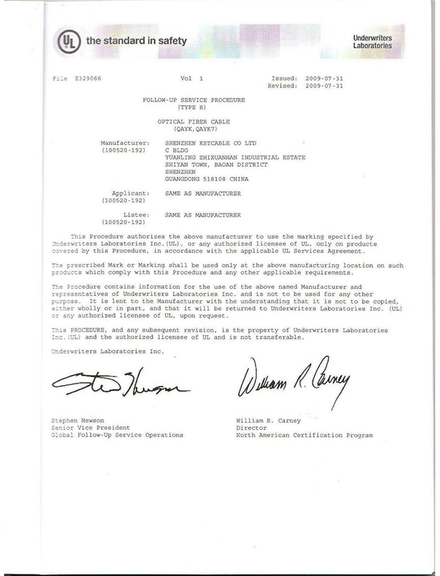 鎧盛通光纜集團(tuán)是一家獨(dú)資企業(yè),本公司通過了ISO9001國際質(zhì)量體系認(rèn)證,美國(UL)認(rèn)證及加拿大(CUL)認(rèn)證,并獲得了國家信息產(chǎn)業(yè)部入網(wǎng)許可證(現(xiàn)為泰爾認(rèn)證),產(chǎn)品均按中國國家標(biāo)準(zhǔn),美國及歐洲行先進(jìn)生產(chǎn)標(biāo)準(zhǔn)生產(chǎn),品質(zhì)保證25年,敬請(qǐng)放心使用!