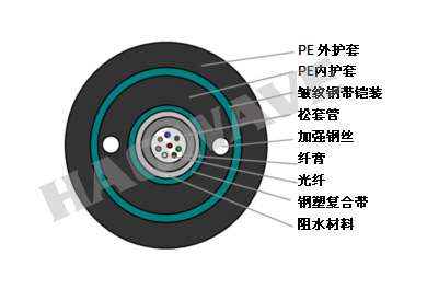 •兩側(cè)放置的兩根平行鋼絲保證光纜的抗拉強(qiáng)度,加強(qiáng)后聚乙烯成內(nèi)護(hù)套,第二層皺紋鋼帶鎧裝聚乙烯護(hù)套成纜。