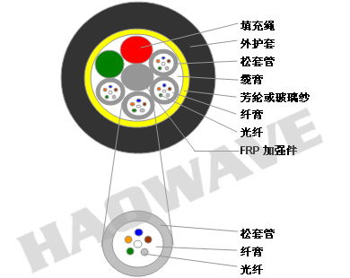 松套管保護(hù)一次涂覆光纖,松套管絞合在加強(qiáng)件的周圍,加強(qiáng)件在光纜的中心
